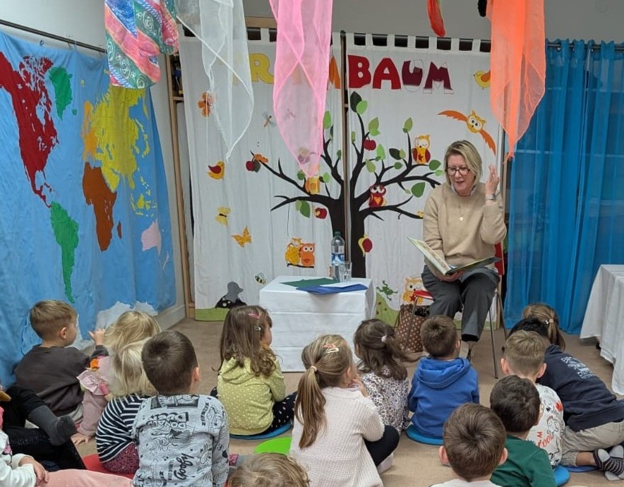 In unseren Krippengruppen durften wir Frau Marianne Schäfer vom Verein Leselernhelfer e.V. begrüßen. Sie hatte eine Auswahl spannender Bücher dabei, und so versammelten sich die Kinder und Erzieherinnen schnell um Frau Schäfer herum. Besonders spannend fanden die Kinder das Buch „Die kleine Raupe Nimmersatt“. Geduldig und liebevoll las Frau Schäfer daraus vor. Die Atmosphäre war sehr lebendig, die Kinder hörten aufmerksam zu und es entstand ein magischer Lesemoment.