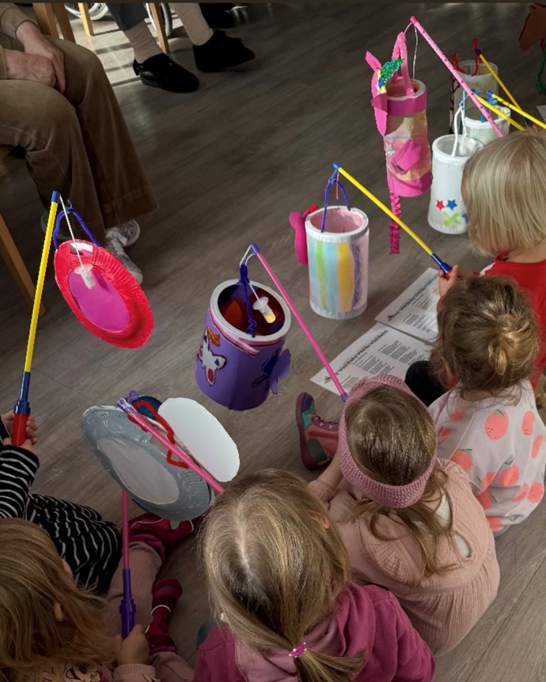 Einen besonderen Vormittag erlebte die Kita Bärenbande in dieser Woche. Gemeinsam mit einigen Kindern besuchten wir das nahegelegene Altersheim, um dort gemeinsam mit den Bewohnerinnen und Bewohnern Herbst- und St.-Martinslieder zu singen. Begleitet von Gitarren und Akkordeon erfüllten bekannte Melodien den Raum und sorgten für eine fröhliche herbstliche Stimmung. Die BewohnerInnen sangen sogar leise mit oder klatschten im Takt der Musik. Die Kinder hatten ihre individuellen selbstgebastelten Laternen mitgebracht, die mit ihren bunten Farben und liebevollen Details viele Blicke auf sich zogen.  Zum Abschluss gab es noch eine süße Überraschung. Das Altenheim bedankte sich herzlich bei den Kindern und schenkt jedem einen Weckmann.