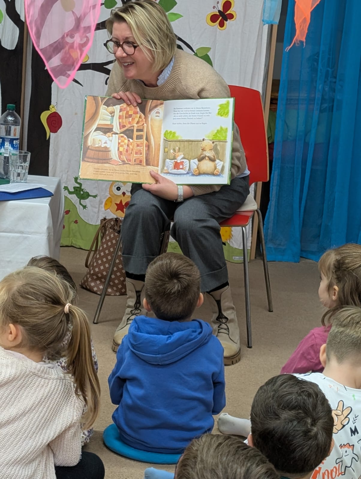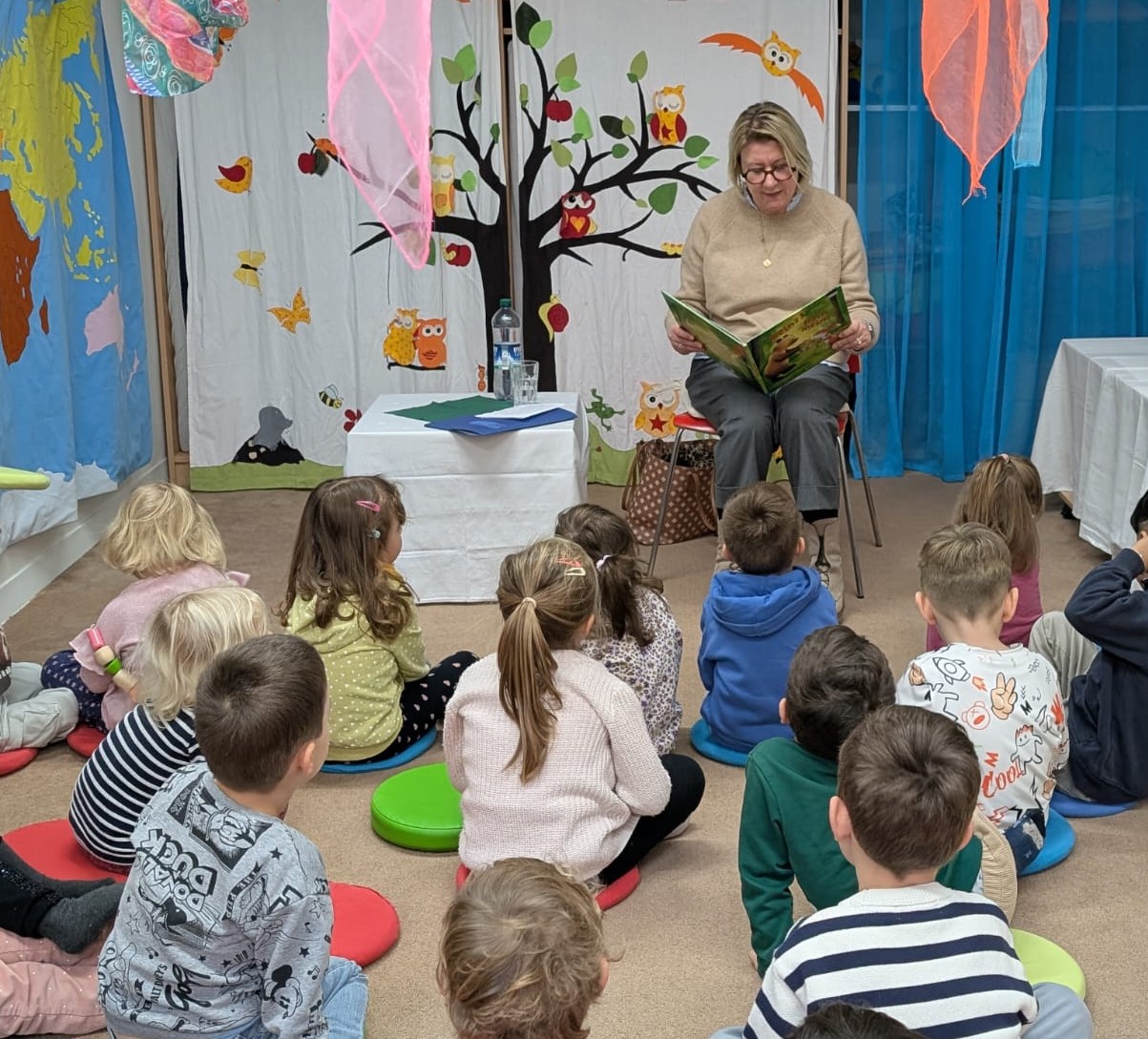 Frau Frey hat viel mit den Kindern gesprochen, Fragen gestellt und die Vorlesestunde sehr lebendig gestaltet. Die Kinder haben aktiv teilgenommen, ihre Gedanken geteilt und zum Beispiel stolz erzählt, wie viele Freunde sie haben. Es war eine fröhliche und sehr offene Gesprächsatmosphäre.