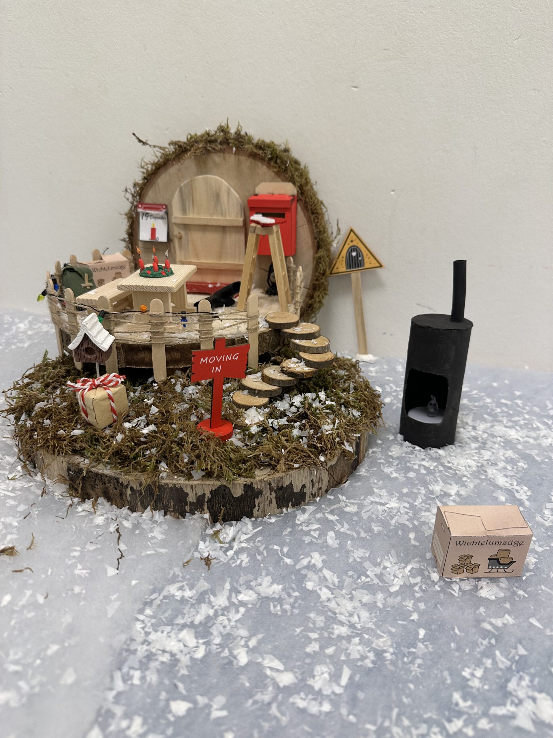 Anfang dieser Woche ist in der Eichenallee ein Elf eingezogen. Er heckt jeden Tag neue Streiche aus und wendet sich auch mit Briefen an die Kinder, wobei er versucht, sie zu überzeugen, ihm bei seinen Streichen zu helfen. Nachdem er Fotos der Kinder mit Kunst verschönert hat, hat er heute unseren Tannenbaum mit Toilettenpapier umwickelt und sich ganz frech obendrauf gesetzt. Die Kinder hoffen, ihn zu erwischen und sind dabei auch ganz flink. Mal schauen, ob es ihnen gelingt.